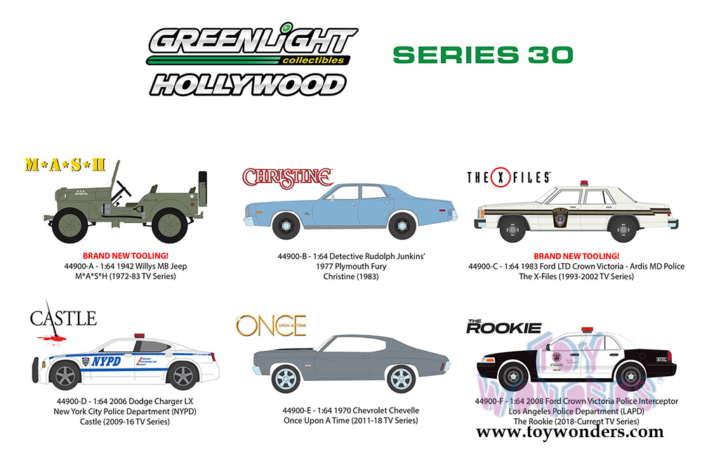 44900/48 Greenlight Hollywood Series 30 - Greenlight has put the love of the silver screen into something slightly smaller with 1:64th scale replicas. Greenlight Hollywood takes iconic film and television vehicles from both the past and present and brings them to life with four-wheeled diecast replicas. 1:64 scale diecast collectible model. These cars are between 2.25" and 3.25" long diecast model cars. Each car individually blister carded. Card size: 5.5" x 7.5". Manufactured by Greenlight.