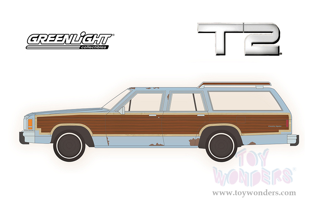 Greenlight - Hollywood Series 32 | Ford LTD Country Squire with Woodgrain Sides (Weathered) "Terminator 2: Judgment Day" (1991) Movie (1979, 1/64 scale diecast model car, Light Blue) 44920C/48