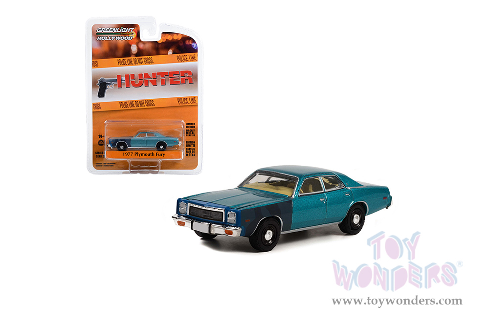44960B/48 Greenlight Hollywood 36 | Sergeant Rick Hunter's 1977 Plymouth Fury "Hunter" (1984-1991) TV Series. Greenlight has put the love of the silver screen into something slightly smaller with 1:64th scale replicas. Greenlight Hollywood takes iconic film and television vehicles from both the past and present and brings them to life with four-wheeled diecast replicas. 1:64 scale diecast collectible model. This Plymouth is a 3" long diecast model car. Each car individually blister carded. Card size: 5.5" x 7.5". Manufactured by Greenlight.
