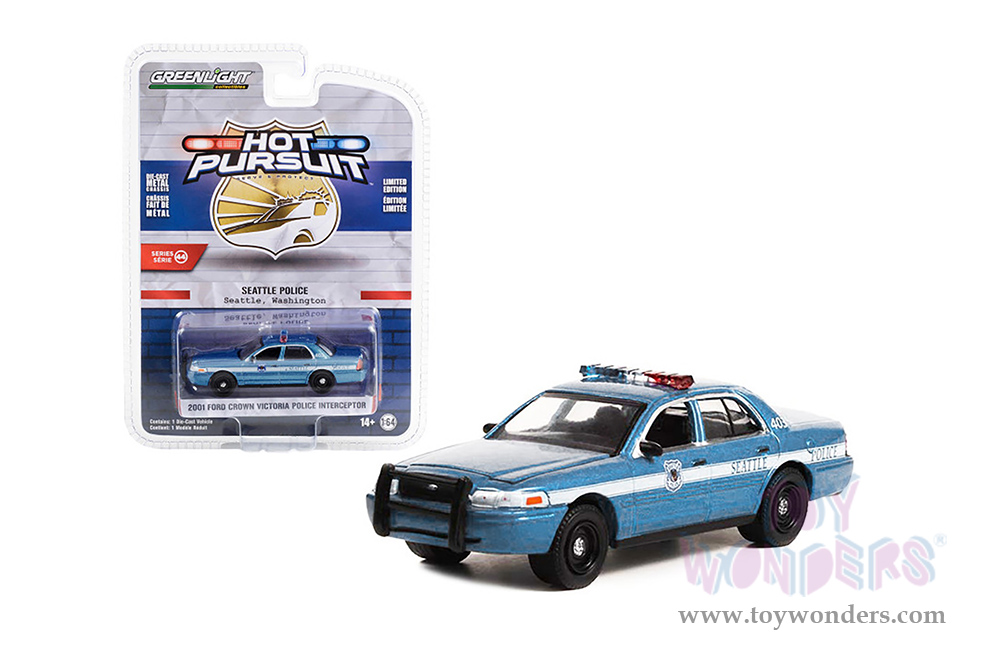 Greenlight - Hot Pursuit Series 44 | Ford Crown Victoria Police Interceptor "Seattle Police, Seattle Washington" (2001, 1/64 scale diecast model car, Light Blue/White stripe) 43020D/48