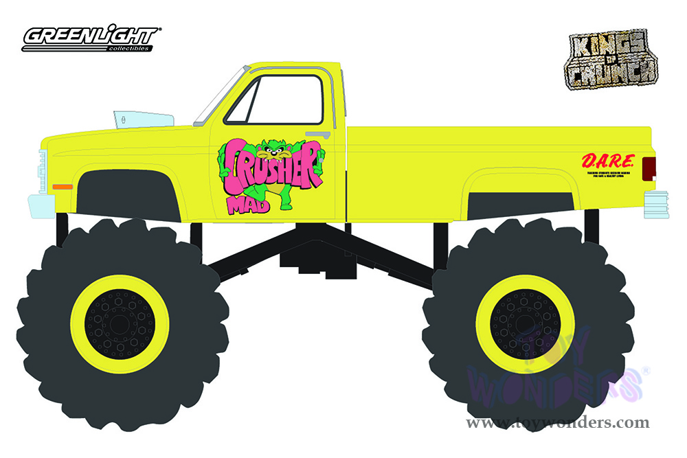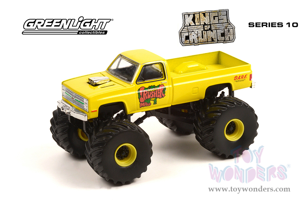 49100C/48 Greenlight - Kings of Crunch Series 10 | 1987 Chevrolet® Silverado™ Monster Truck - Mad Crusher (6 pcs. set). 1:64 scale diecast collectible model car. Dimensions of each Monster Truck is 3.5" Long. 6 pc set. Each car individually blister carded. Card size: 7.5" x 5.5". These cars are manufactured by Greenlight. Item 49100C/48 is in yellow.