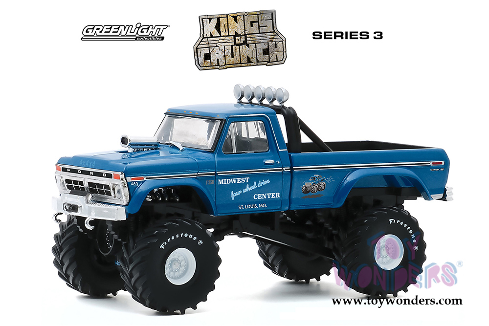 Greenlight - Kings of Crunch Series 3 | Ford F-250 Monster Truck (with 48-Inch Tires) Midwest Four Wheel Drive & Performance Center (1974, 1/43 scale diecast model car, Blue) 88031