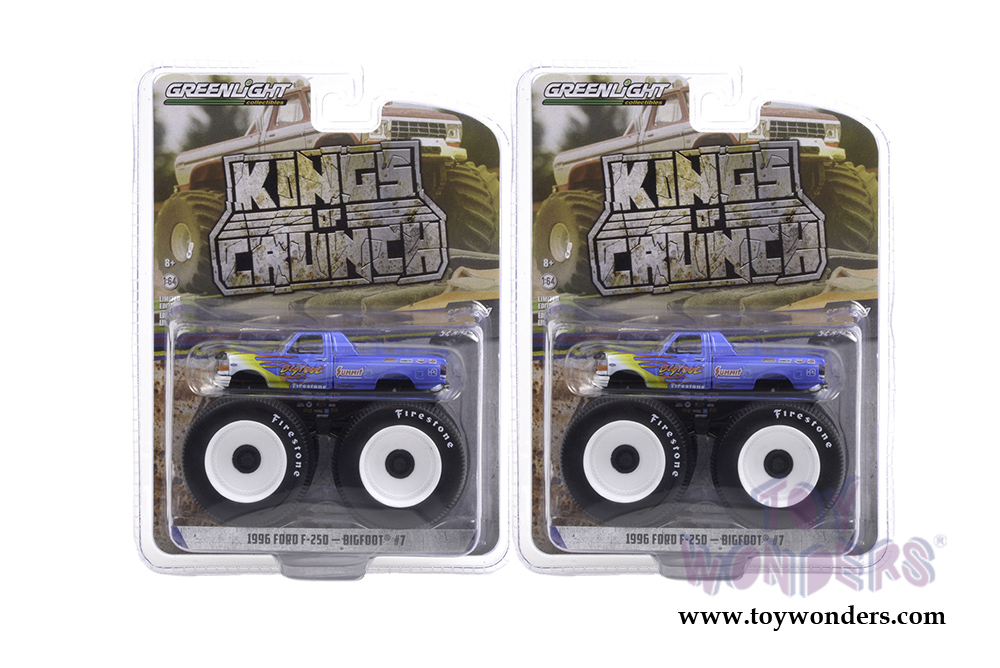49090A/48 Greenlight - Kings of Crunch Series 9 | 1996 Ford F-250 Monster Truck - Bigfoot #7 (6 pcs. set). 1:64 scale diecast collectible model car. Dimensions of each Monster Truck is 3.75" Long. 6 pc set. Each car individually blister carded. Card size: 7.5" x 5.5". These cars are manufactured by Greenlight. Item 49090A/48 is in BLUE with flames.