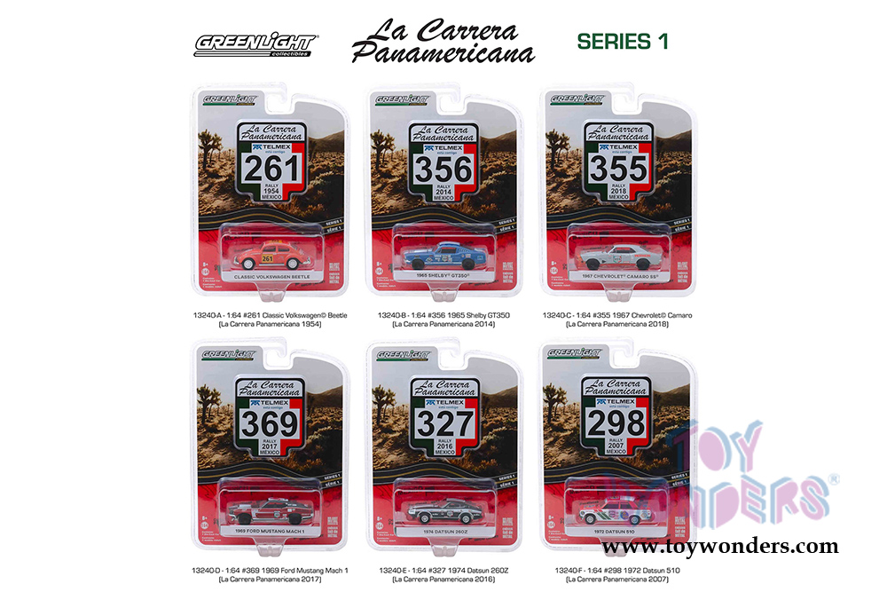 13240/48 Greenlight - La Carrera Panamericana Series 1 (6 pcs. set) 1:64 Scale. These cars are 2" to 3.25" long diecast metal collectible. Each individually blister carded. Limited Edition. These cars are manufactured by Greenlight. Card size: 7.5" x 5.75". Available in assorted colors and styles.