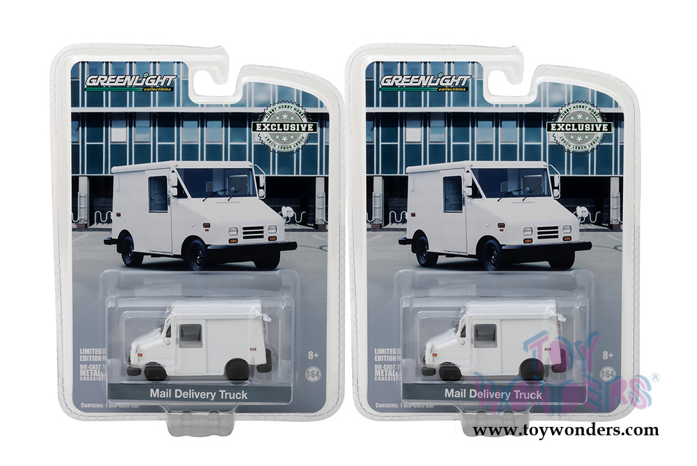 29911/48 Greenlight - Long Live Undecorated Mail Delivery Truck. 1:64 scale diecast collectible model. This mail truck is a 2.75"L x 1.25"W x 1.5"H long diecast metal car. Metal Body and Chassis. Each car individually blister carded. Card size: 5.5" x 7.5". 12 pcs/inner. Manufactured by Greenlight. 29911/48 is plain, it allows to decorate as desired.