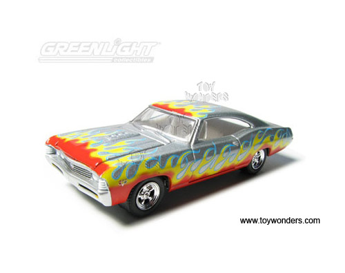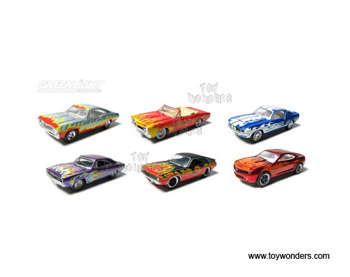 12685/48 Greenlight Muscle Car Garage Up in Flames - Series 1. 1:64 scale diecast collectible model car. 3" long die cast cars with openable hood. Limited edition. Each car individually blister carded. 12 pcs/inner. Card size: 5.5" x 7.5". These cars are manufactured by Greenlight. Assortment includes: