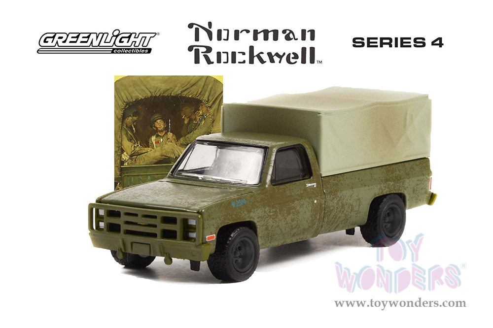 Greenlight - Norman Rockwell™ Series 4 | Chevrolet® M1008 Pickup Truck with Cargo Cover (Weathered) (1984, 1/64 scale die cast model car, Green) 54060F/48