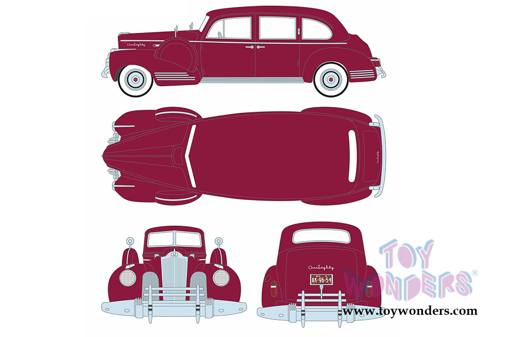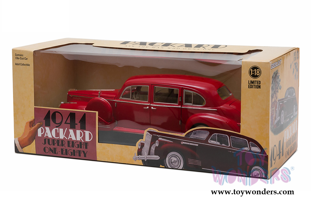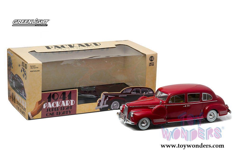 12971 Greenlight - 1941 Packard Super Eighty One - Eighty Hard Top. 1:18 scale diecast collectible model car. This Packard is a 12.5"L x 4"W x 3.5"H die-cast collection car with openable doors and hood. This '41 Packard SuperEighty One-Eighty is manufactured by Green Light. Item 12971 is in Laguna MAROON color. Individually packed in a vintage Packard Themed window box. Box size: 15.75"L x 7.5"W x 6.25"H.