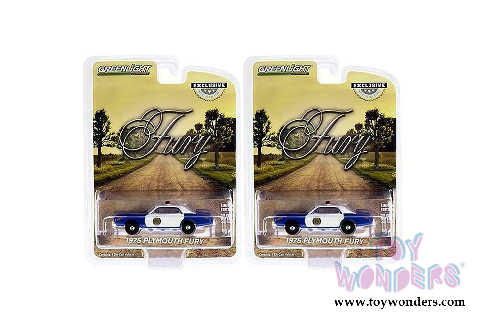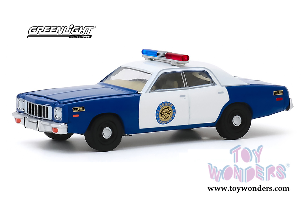 30151/48 Greenlight - 1975 Plymouth Fury - Osage County Sheriff. 1:64 scale diecast collectible model car. This '75 Plymouth Fury Police car is a 3.5" long diecast metal car. Each car individually blister carded. Card size: 5.75" x 7.75". This 1975 Plymouth Fury is manufactured by Greenlight. 30151/48 is in white with blue. 12 pcs/inner.