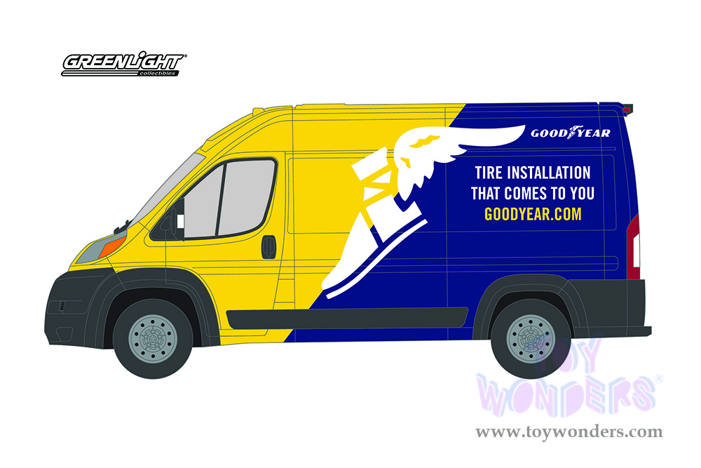 Greenlight - Route Runners Series 3 | Ram ProMaster 2500 Cargo High Roof Van "Goodyear" 'Tire Installation That Comes To You' (2019, 1/64 scale diecast model car, Yellow/Blue) 53030E/48