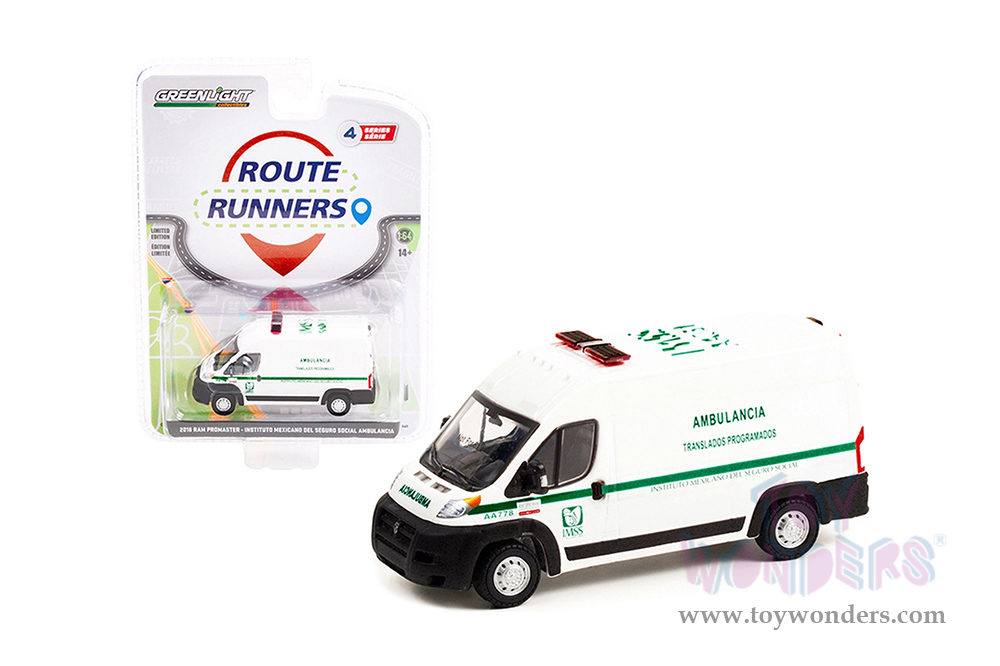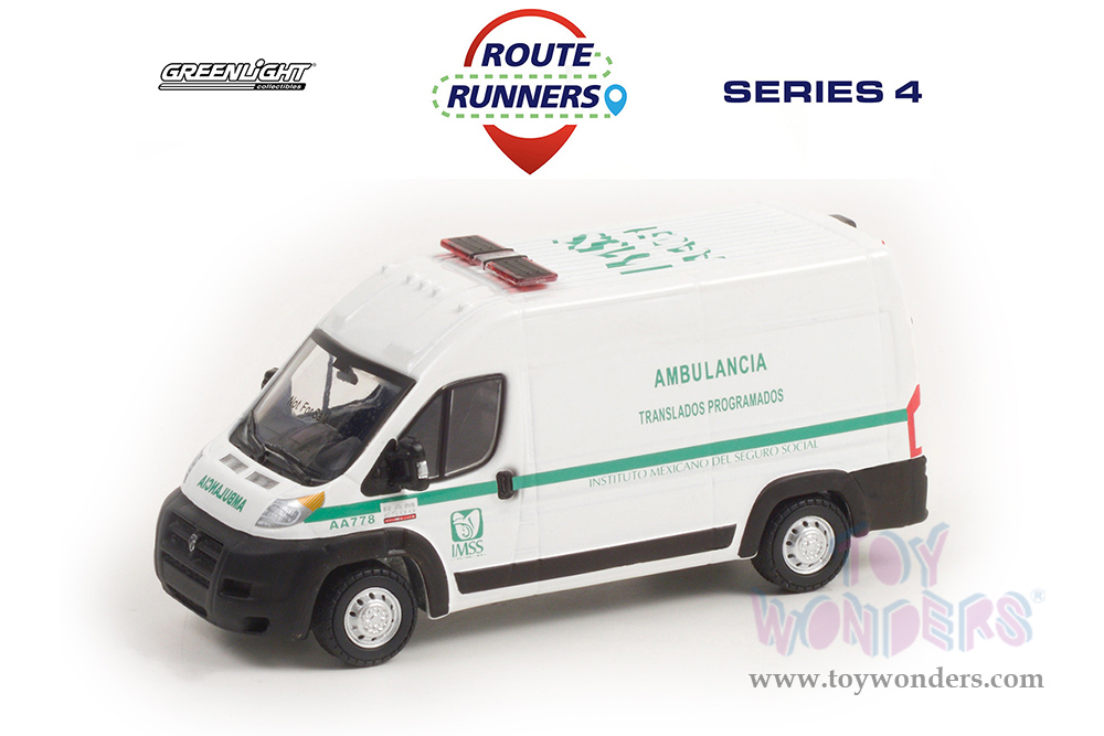53040C/48 Greenlight - Route Runners Series 4 | 2018 Dodge Ram ProMaster Van "Instituto Mexicano Del Seguro Social Ambulancia" Ensenada (Mexico). 1:64 scale diecast collectible model. This Van is a 3.25"L x 1.25"W x 1.25"H long diecast metal car. Each car individually blister carded. Card size: 5.5" x 7.5". 6 pcs/inner. Manufactured by Greenlight. 53040C/48 is in white with green stripes.