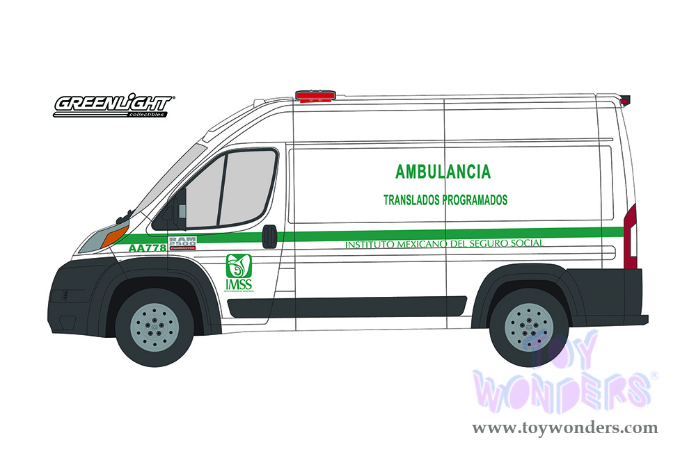 Greenlight - Route Runners Series 4 | Dodge Ram ProMaster Van "Instituto Mexicano Del Seguro Social Ambulancia" Ensenada (Mexico) (2018, 1/64 scale diecast model car, White/Green stripes) 53040C/48