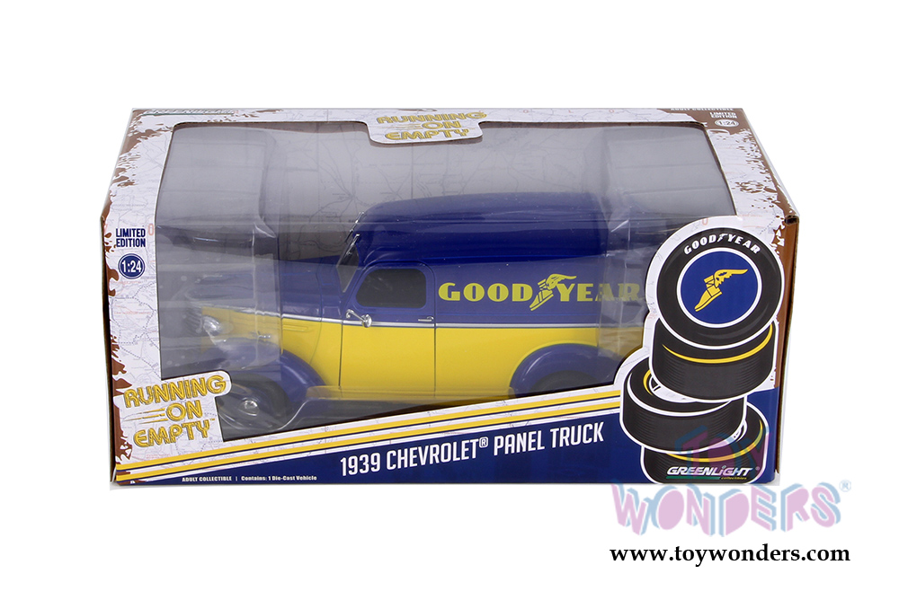 18243 Greenlight - Running on Empty | Goodyear Tires 1939 Chevrolet® Panel Truck. 1:24 scale diecast collectible model car. This Chevy Truck is an 8"L x 3.25"W x 3.25"H diecast collection car with openable doors and hood. Authentic decoration, rubber tires and true-to-scale detail. This 1939 Chevrolet Panel Truck is manufactured by Greenlight. Limited Edition. 18243 is in YELLOW with blue color. Individually packed in a window box WB. Box size: 9.5"L x 4.75"W x 4.25"H.