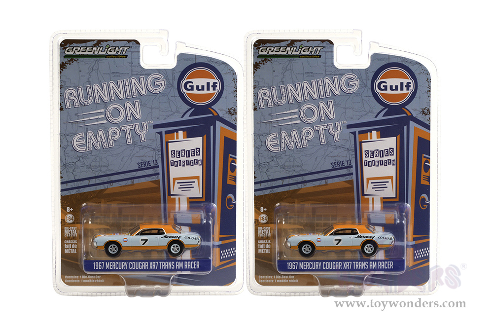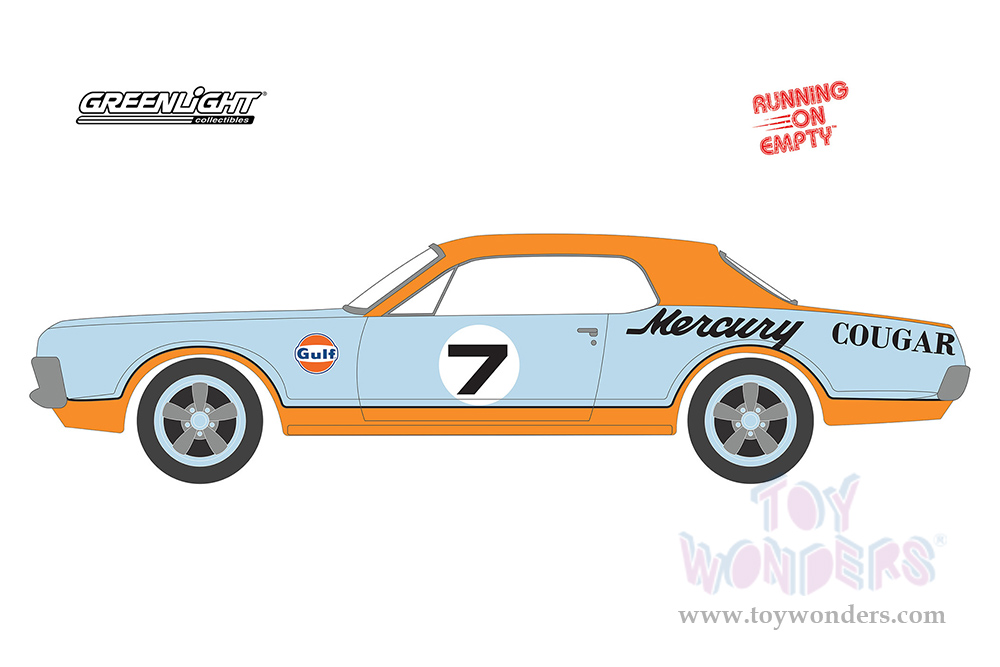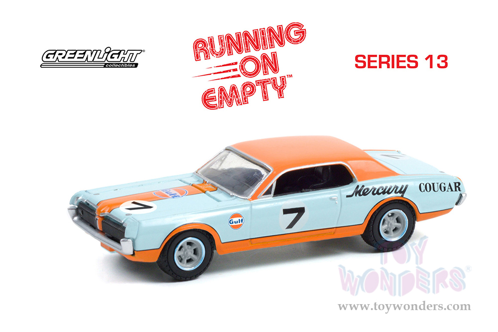 Greenlight - Running on Empty Series 13 | Mercury Cougar XR7 Trans Am T/A Racer #7 "Gulf Racing" (1967, 1/64 scale diecast model car, Light Blue/Orange) 41130B/48