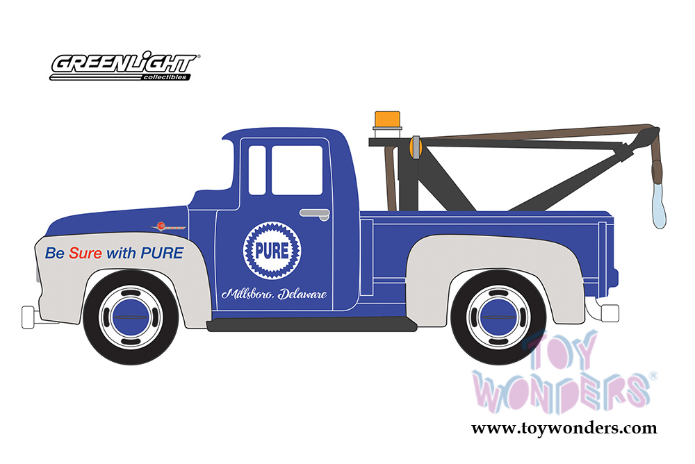 Greenlight - Running on Empty Series 5 | Ford F-100 with Drop-in Tow Hook Pure Oil "Be Sure with Pure" (1956, 1/64 scale diecast model car, Blue/White) 41050A/48