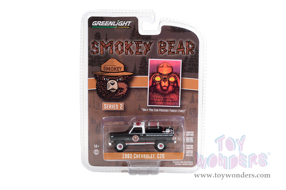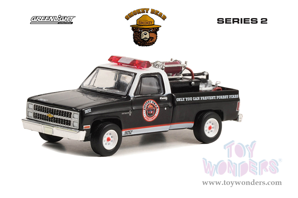 Greenlight - Smokey Bear Series 2 | Chevrolet® C20 Custom Deluxe Pickup Truck with Fire Equipment, Hose and Tank "Only You Can Prevent Forest Fires" (1982, 1/64 scale diecast model car, Black with White Top) 38040C/48