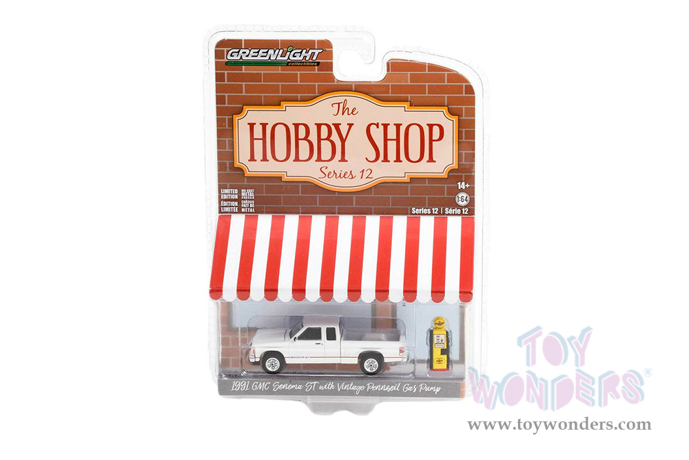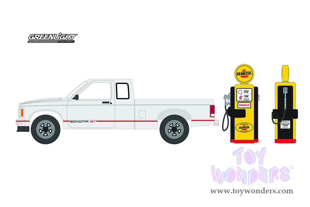 Greenlight - The Hobby Shop Series 12 | GMC® Sonoma ST Pickup Truck and Vintage "Pennzoil" Gas Pump (1991, 1/64 scale diecast model car, White) 97120D/48