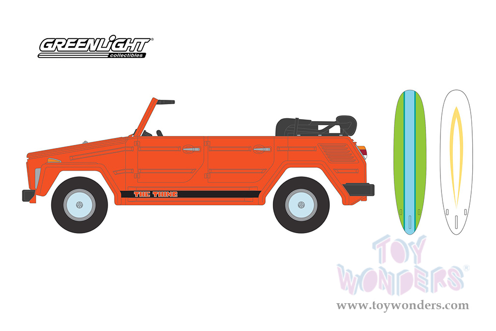 97140C/48 Greenlight - The Hobby Shop Series 14 | 1971 Volkswagen Thing (Type 181) "The Thing" and Surfboards, 6 pcs set. 1:64 scale diecast collectible model car. This Volkswagen is 3" long. Packed in an individual Blister Pack. Pack size: 7.5"L x 5.5"W. 6 pcs per inner. 97140C/48 is in Orange with Black Stripes.