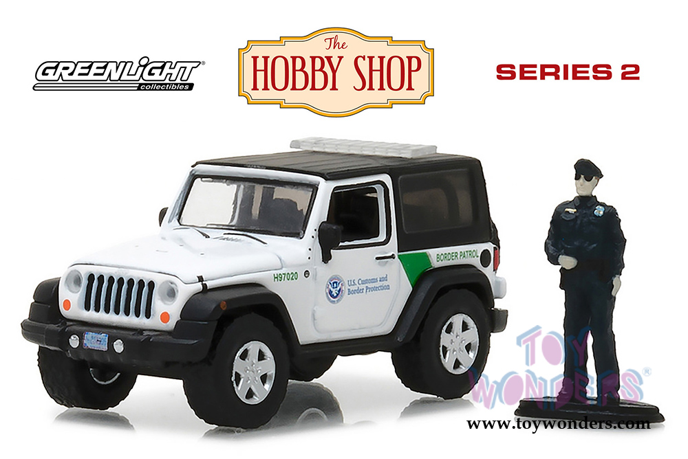 Greenlight - The Hobby Shop Series 2 | Jeep Wrangler US Customs and Border Protection with Officer Figure (2016, 1/64 scale diecast model car, White) 97020E/48