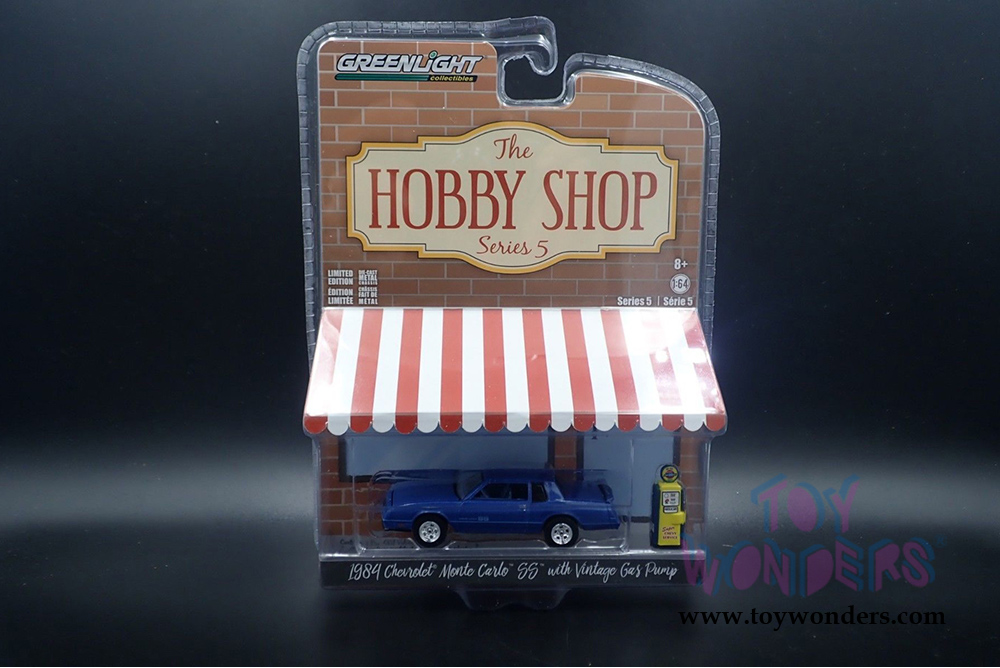 97050F/48 Greenlight - The Hobby Shop Series 5 | 1984 Chevrolet Monte Carlo SS with Vintage Gas Pump (six-piece set). 1:64 scale diecast collectible model. This Chevy is a 3" long diecast metal car, gas pump is 1" High. Each car individually blister carded. Card size: 7.5" x 5.75". 6 pcs/inner. Manufactured by Greenlight. 97050F/48 is in BLUE color.