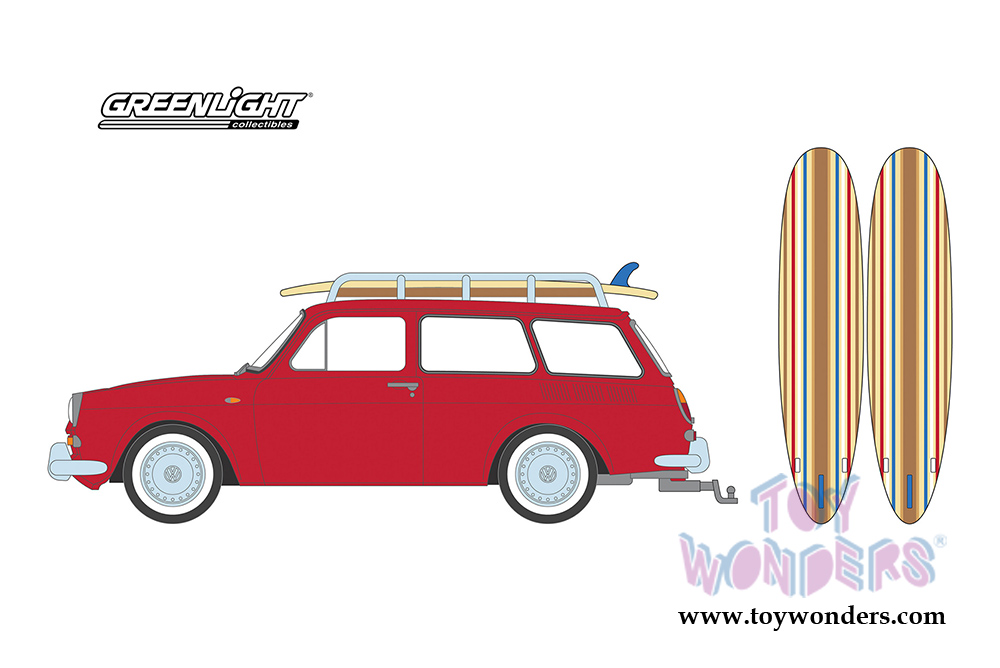 Greenlight - The Hobby Shop Series 5 | Volkswagen Type-3 Squareback with Roof Rack and Surfboards (1962, 1/64 scale diecast model car, Red) 97050A/48
