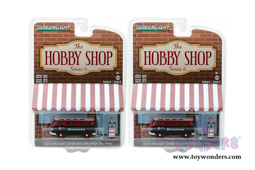 97060A/48 Greenlight - The Hobby Shop Series 6 | 1964 Volkswagen Samba Bus with Firestone Gas Pump (six-piece set). 1:64 scale diecast collectible model. This Volkswagen is a 2.75" long diecast metal car, Gas Pump is 1.25" High. Each set individually blister carded. Card size: 7.5" x 5.75". 6 pcs/inner. Manufactured by Greenlight. 97060A/48 is in RED with BLACK color.