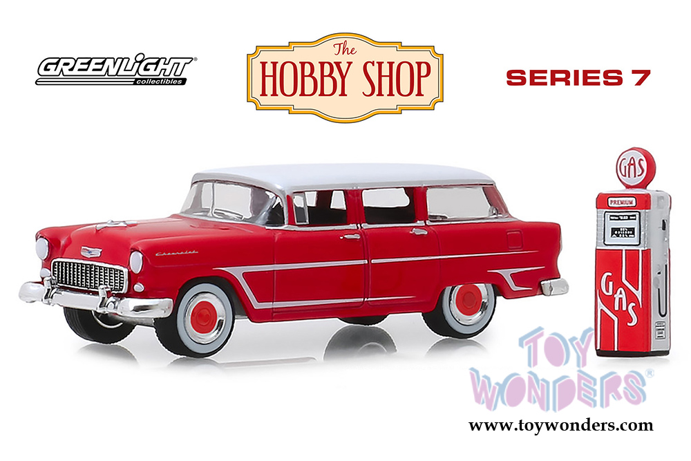 Greenlight - The Hobby Shop Series 7 | Chevrolet® Two-Ten Townsman with Vintage Gas Pump (1955, 1/64 scale diecast model car, Red) 97070A/48