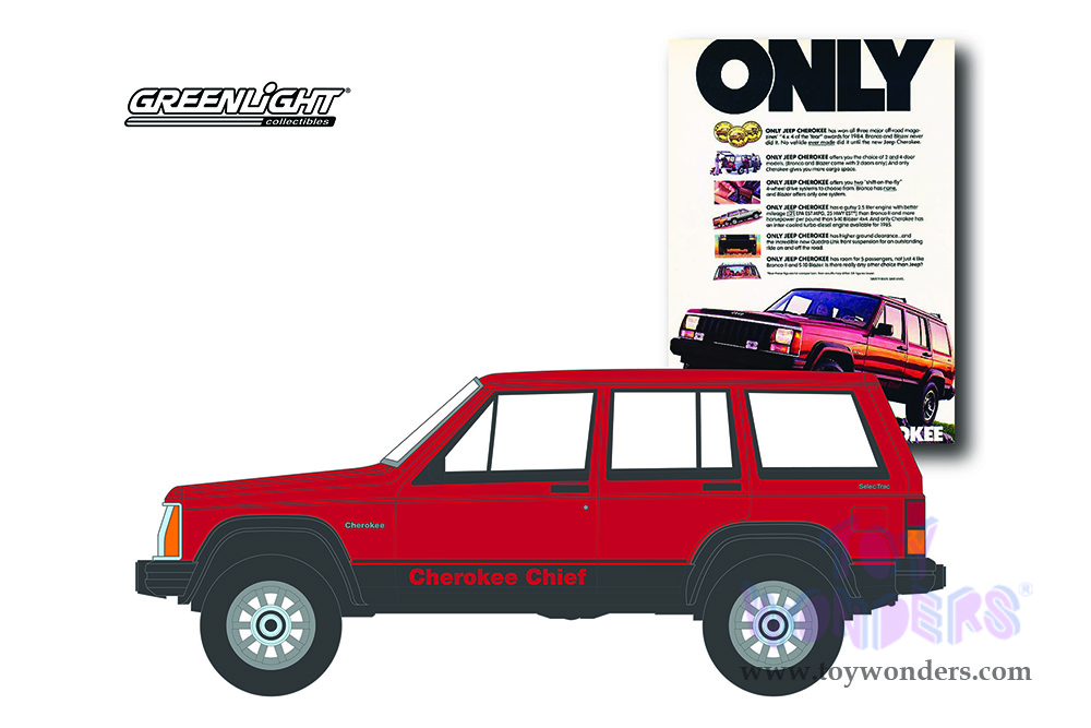 Greenlight - Vintage Ad Cars Series 5 | Jeep® Cherokee Chief "Only in a Jeep® Cherokee" (1984, 1/64 scale diecast model car, Red/Black Stripes) 39080F/48