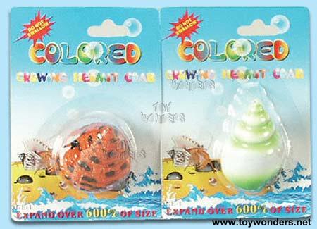 6021 Growing Hermit Crab. Put the Growing Hermit Crab in a container full of clean water in room temperature, & watch it grow out of the shell! It takes up to 72 hrs for fully expansion. Grows 600% in size from its original size. Non-toxic, for ages 3+ years. card size: 2.75"x4". asstd. shell designs. 48 pcs per color display box. 6 display boxes per case.