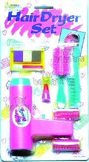 938091 Hair Dryer Set The play set includes brush, comb, hair curlers, make-up compact, and hair dryer. card size: 6"x11". 24 pcs/inner.