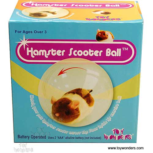 8086 Hamster Scooter Ball. 4" furry hamster runs in a 5" transparent exercise ball. Looks real! Requires 2 "AAA" batteries. Box size: 5"L x 3.5"H x 5"H.