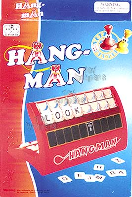 3327 Hang-Man Game Set. Game includes plastic letter pieces with a display panel to hold letters and a "hang-man" indicator. Box size: 7.5"W x 10"H x 1.25"D.