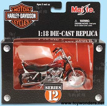31760L MAISTO Harley-Davidson Motorcycles (Series 12) Scale: 1:18 Dimensions (approx.): 5.5"L x 3"H Harley Davidson die cast metal motorcycles feature working steering, working/detailed suspension, and kickstand. Manufactured by Maisto