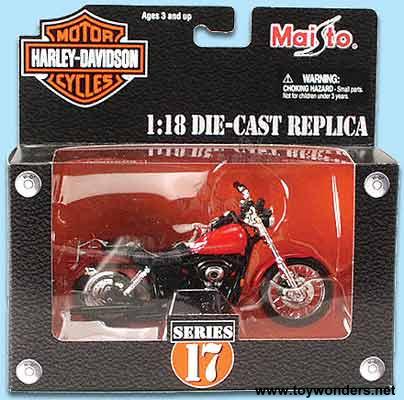 31360Q MAISTO Harley-Davidson Motorcycles (Series 17) Scale: 1:18 Dimensions: 5.5"L x 3"H Harley Davidson die cast metal motorcycles with workable steering, workable/detailed suspension, and kickstand. Manufactured by Maisto