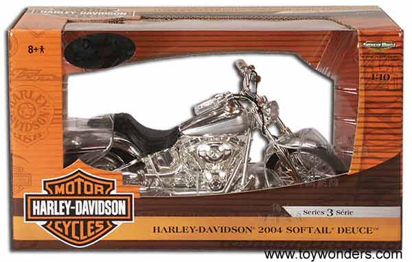 33154X ERTL - American Muscle Harley Davidson Softail Deuce - Series 3 (2004). 1:10 scale diecast model. This 2004 Harley Davidson Series 3 is a 9.5" long diecast motorcycle with working suspension, steering, and kickstang. This Harley motor bike is manufactured by RC2 Brands. Color: CHROME with black seat.