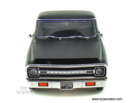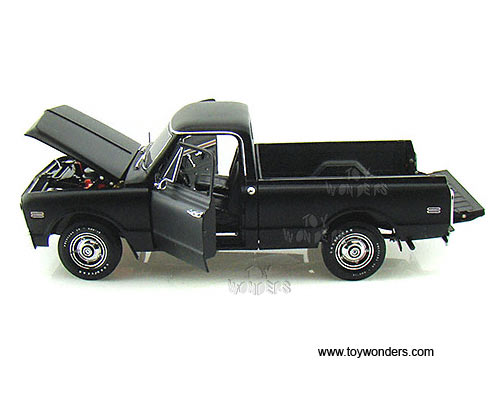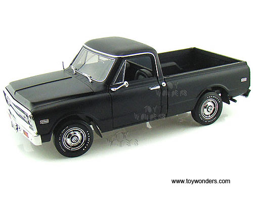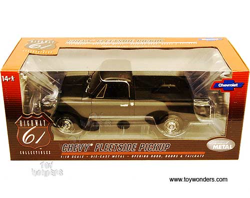50878 Highway 61 - 1972 Chevy Fleetside C10 Pickup Truck w/ Removable Bed Cover. 1:18 scale diecast collectible model car. This Chevrolet Fleetside C-10 Pick-up is a 10.25"L x 4.5"W x 3.5"H die cast metal car with openable doors, hood & tailgate, fully detailed engine, steerable front wheels, working suspension, and soft interior & soft rubber tires. This 1972 Chevy Fleetside Pick up is manufactured by Die-cast Promotions. Item 50878 is in FLAT BLACK color. Individually packed in a window box. Box size: 13.75"L x 6.5"W x 5.75"H. GM is a trademark of the General Motors Corporation.