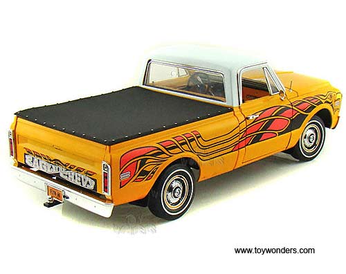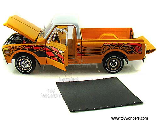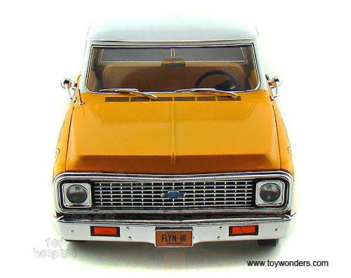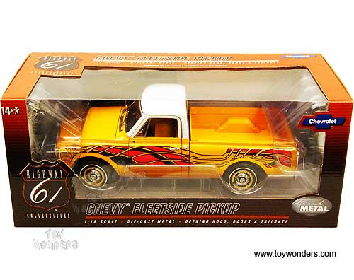 50879 Highway 61 - 1972 Chevy Fleetside C10 Pickup Truck w/ Removable Bed Cover. 1:18 scale diecast collectible model car. This Chevrolet Fleetside C-10 Pick-up is a 10.25"L x 4.5"W x 3.5"H die cast metal car with openable doors, hood & tailgate, fully detailed engine, steerable front wheels, working suspension, and soft interior & soft rubber tires. This 1972 Chevy Fleetside Pick up is manufactured by Die-cast Promotions. Item 50879 is in YELLOW color with eagle graphic. Individually packed in a window box. Box size: 13.75"L x 6.5"W x 5.75"H. GM is a trademark of the General Motors Corporation.
