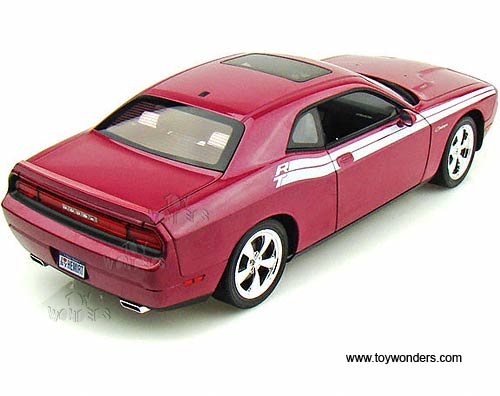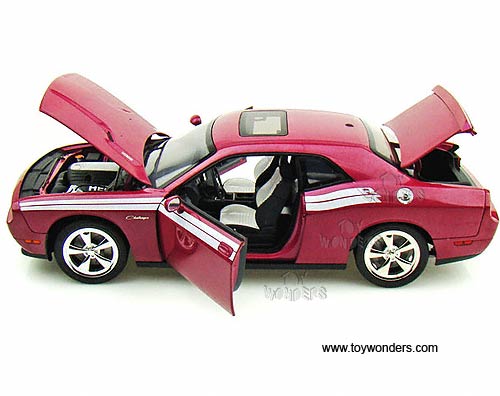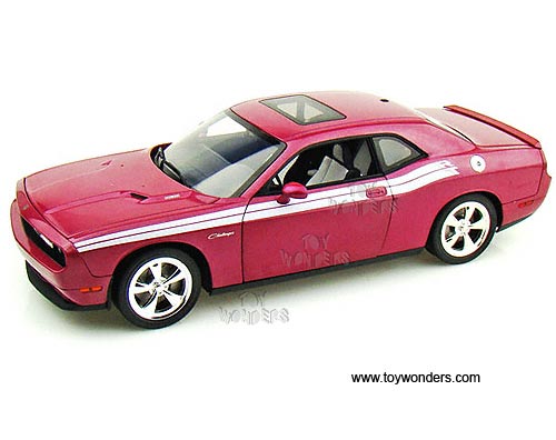 50856 Highway 61 - 2010 Dodge Challenger R/T Hard Top w/ Sunroof. 1:18 scale diecast collectible model car. This Dodge Challenger R/T is a 10.5"Lx 4"Wx 3"H die cast metal car with openable doors, hood & trunk. This 2010 Dodge Challenger R/T is manufactured by Highway 61. 50856 is in FURIOUS FUCHSIA color (like purple) with white stripes. Individually packed in a window box. Box size: 13.75"Lx 6.3"Wx 5.75"H.