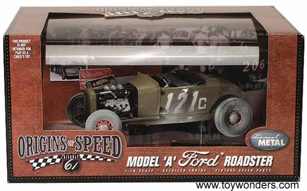 60030GY HIGHWAY 61 1929 Ford Model A Flthd V-8 Roadster Convertible. 1:18 scale diecast model car. This 1929 Ford is an 8" long diecast car with opening doors/trunk, realistic door & hood hinges, stainless steel tag, 8-page historical booklet, and fully wired & plumbed 4-cyl. or v-8 "Flathead" engine. Origins of Speed. This 29 Ford is manufactured by F.F. Ertl III, Inc. 60030 in GREY color. Individually packed in a window box.
