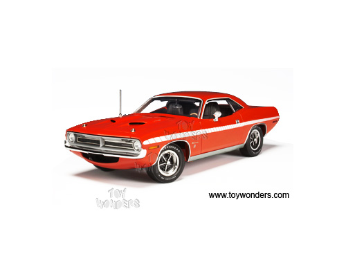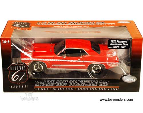 60166 HIGHWAY 61 - 1970 Plymouth Barracuda Gran Coupe 383 Hard Top. 1:18 scale diecast collectible model car. This Plymouth Barracuda Gran Coupe 383 is a 10.25"L x 4"W x 2.75"H die cast metal car with openable doors, hood & trunk, fully detailed engine, working steering and suspension, soft interior and soft rubber tires. This Plymouth Barracuda Gran Coupe 383 is manufactured by Highway 61. 60166 in TOR RED color with White stripes. Individually packed in a window box. Box size: 13.75"L x 6.375"W x 5.75"H.