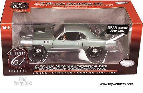60153BU HIGHWAY 61 - 1971 Plymouth Hemi Barracuda Hard Top. 1:18 scale diecast collectible model car. This Plymouth Hemi Barracuda is a 10"Lx 4"Wx 2.75"H die cast metal car with openable doors, hood & trunk, fully detailed engine, working suspension and steering, detailed interior and soft rubber tires. This Plymouth Hemi Barracuda is manufactured by Highway 61. Item 60153 is in BLUE color. Individually packed in a window box. Box size: 14"Lx 6.5"Wx 5.75"H.