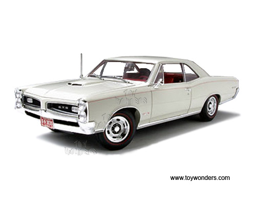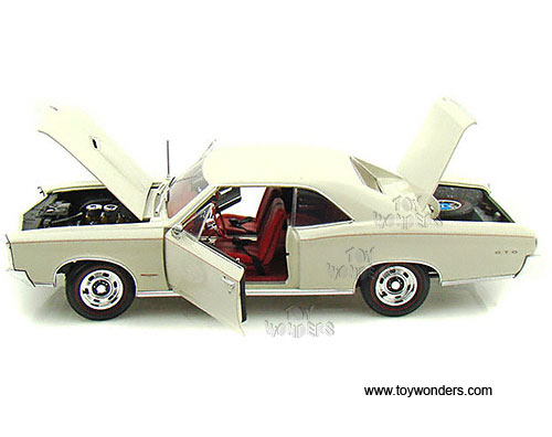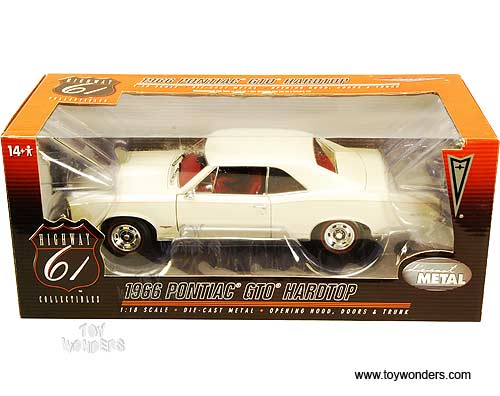 50778 Highway 61 - 1966 Pontiac GTO Hard Top. 1:18 scale diecast collectible model car. This Pontiac GTO is an 11.25"L x 4"W x 2.75"H die cast metal car with openable doors, hood & trunk, fully detailed engine, working suspension and steering, and soft interior & soft rubber tires. This 1966 Pontiac GTO is manufactured by Highway 61. Item 50778 is in CAMEO WHITE color (like beige). Individually packed in a window box. Box size: 13.75"L x 6.5"W x 5.75"H. GM is a trademark of the General Motors Corporation.