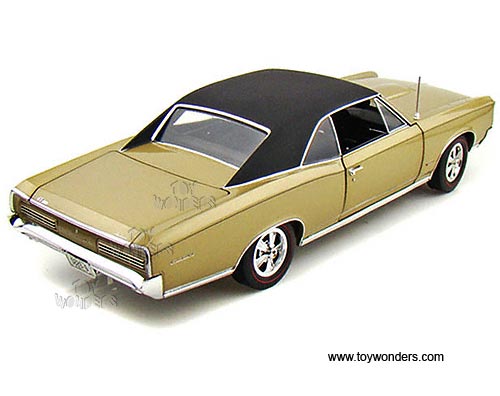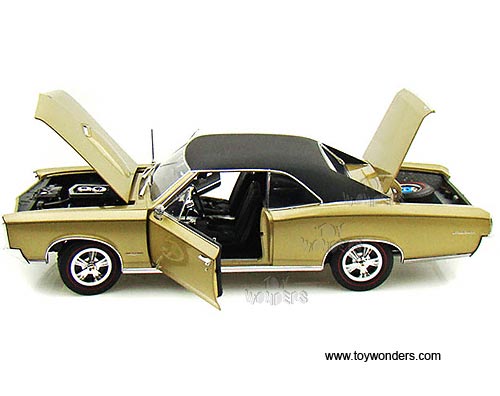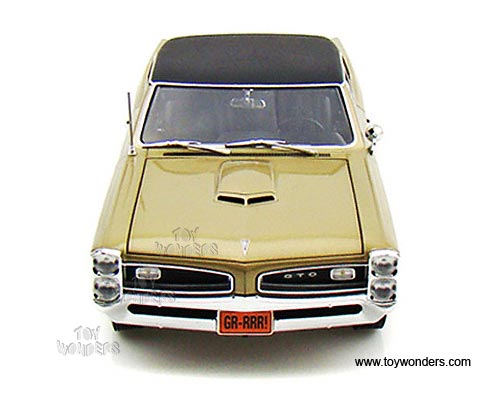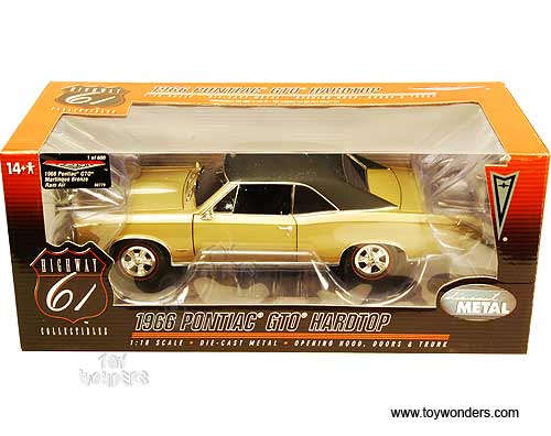50779 Highway 61 - 1966 Pontiac GTO Hard Top. 1:18 scale diecast collectible model car. This Pontiac GTO is an 11.25"L x 4"W x 2.75"H die cast metal car with openable doors, hood & trunk, fully detailed engine, working suspension and steering, and soft interior & soft rubber tires. This 1966 Pontiac GTO is manufactured by Highway 61. Item 50779 is in MARTINIQUE BRONZE color with Black roof. Individually packed in a window box. Box size: 13.75"L x 6.5"W x 5.75"H. GM is a trademark of the General Motors Corporation. Limited edition 1 of 600 pcs.