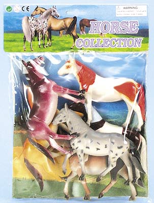 9905/6 Horse Collection. 6.75" plastic horse collection. Packed in plastic bag with header card hang-up. Package size: 12.5" x 9". 12 sets/inner.