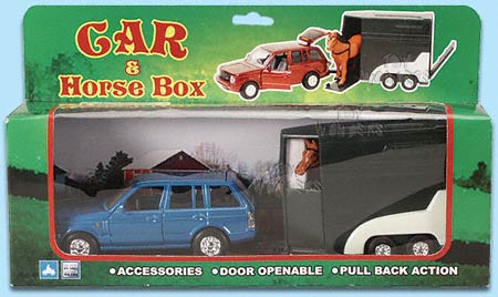 450W Horse Vehicle Set. 5" diecast pullback vehicle with 4" horse trailer. The horse trailer also comes with one 3" horse and open doors. Box size: 11"Lx 2.5"Wx 6.24"H.