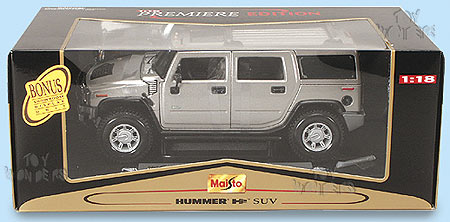 36631PW MAISTO Hummer H2 SUV (2003). 1:18 scale diecast model. This 2003 Hummer sports utility vehicle is a 9.75" long x 4.25"W x 4.25"H highly detailed diecast metal with detailed engine/components, opening front/rear doors and hood, skylight. working spring suspension, and workable steering. Premiere Edition. Sits on stackable display platform. This 03 Humvee is manufactured by Maisto. PEWTER color.