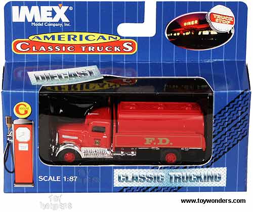 870040 IMEX American Classic Trucks - CO 16 Fire Dept Water Tanker Truck. 1:87 scale diecast collectible model car. This Fire Department tanker truck is a 3.5"Lx 1.25"Wx 1.25"H die cast metal car with free wheel action. Individually packed in a window box. Box size: 5.75"Lx 1.5"Wx 2.75"H. This water tanker truck is manufactured by Imex. 870040 in RED color.