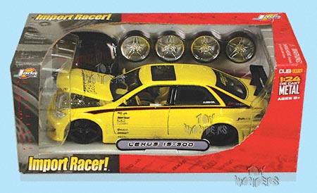 53725 Import Racer! Lexus IS-300 Scale: 1:24 Dimensions: 8.25"L x 3"W x 2.25"H Lexus IS 300 die cast tuner with opening doors/hood/trunk, free wheeling, extra tires/rims, hood cover, black spoke RO_JA & RO_JA Neo-5 series rims, and street racer styling. Screwdriver included for swapping parts. Sound system in trunk. Manufactured by Jada Toys Packaged in window box 6 pcs per inner box in assorted cars