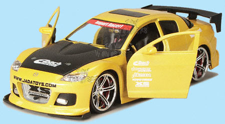 50385CR JADA Import Racer! Mazda RX-8 (1:24) Scale: 1:24 Mazda RX8 8"L die cast sports car features opening doors/hood/trunk, street racer styling, and Do Luck Double Six rims. Manufactured by Jada Toys 4 pcs per display box in assorted colors
