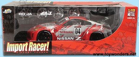 63314R JADA Import Racer! Nissan 350Z. 1:18 scale diecast model. This Nissan is a 9.5"L diecast tuners with opening doors/hood/trunk, extra tires/rims & hood cover, and Formula 7 & Rival rims. With screwdriver for swapping parts. Display platform. This Nissan tuner/sports car is manufactured by Jada Toys. RED color.